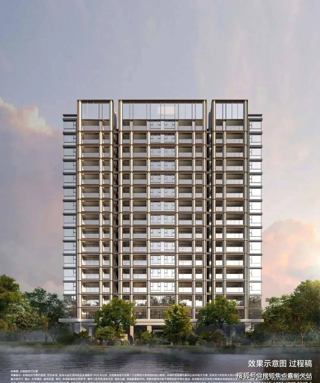材质:局部温润石材、仿铜铝板、仿石铝板及局部仿石涂料,竖向铝板提升品质感